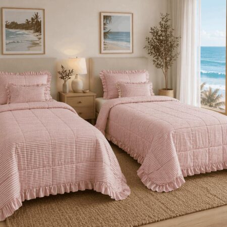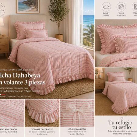 Colcha Dahabeya con volante 3 piezas, diseño elegante de inspiración italiana. Su tejido suave y ligero aporta confort y estilo, con acabado acolchado y volante decorativo. Incluye cojines a juego (45×45 + 30×50) para un dormitorio armonioso y sofisticado.