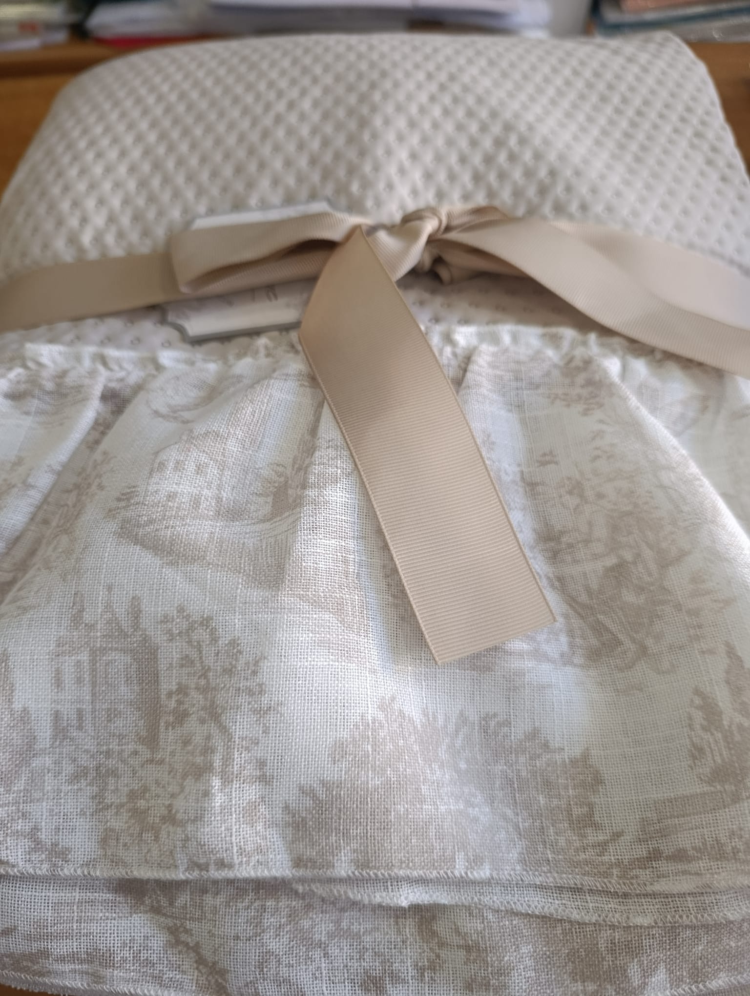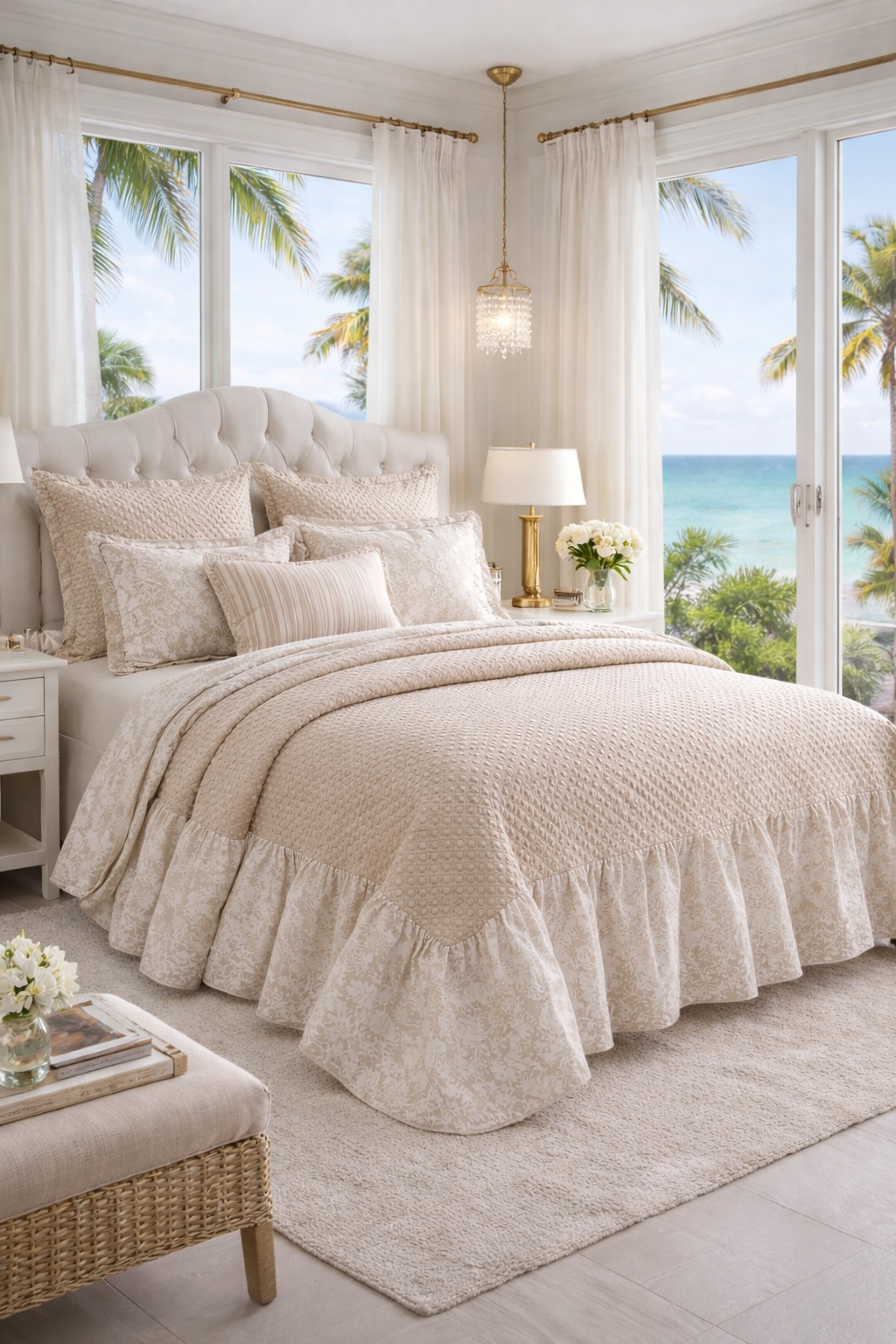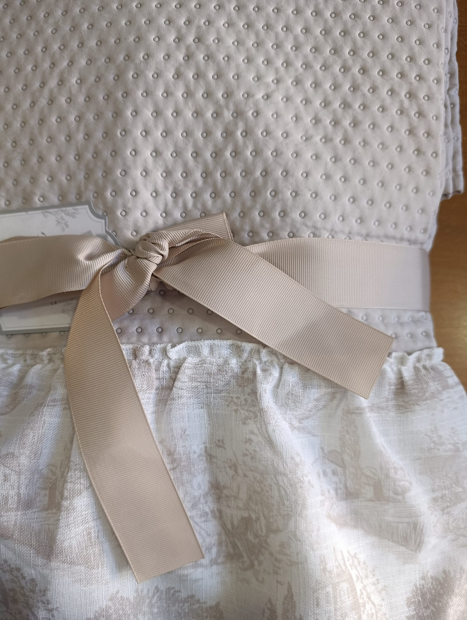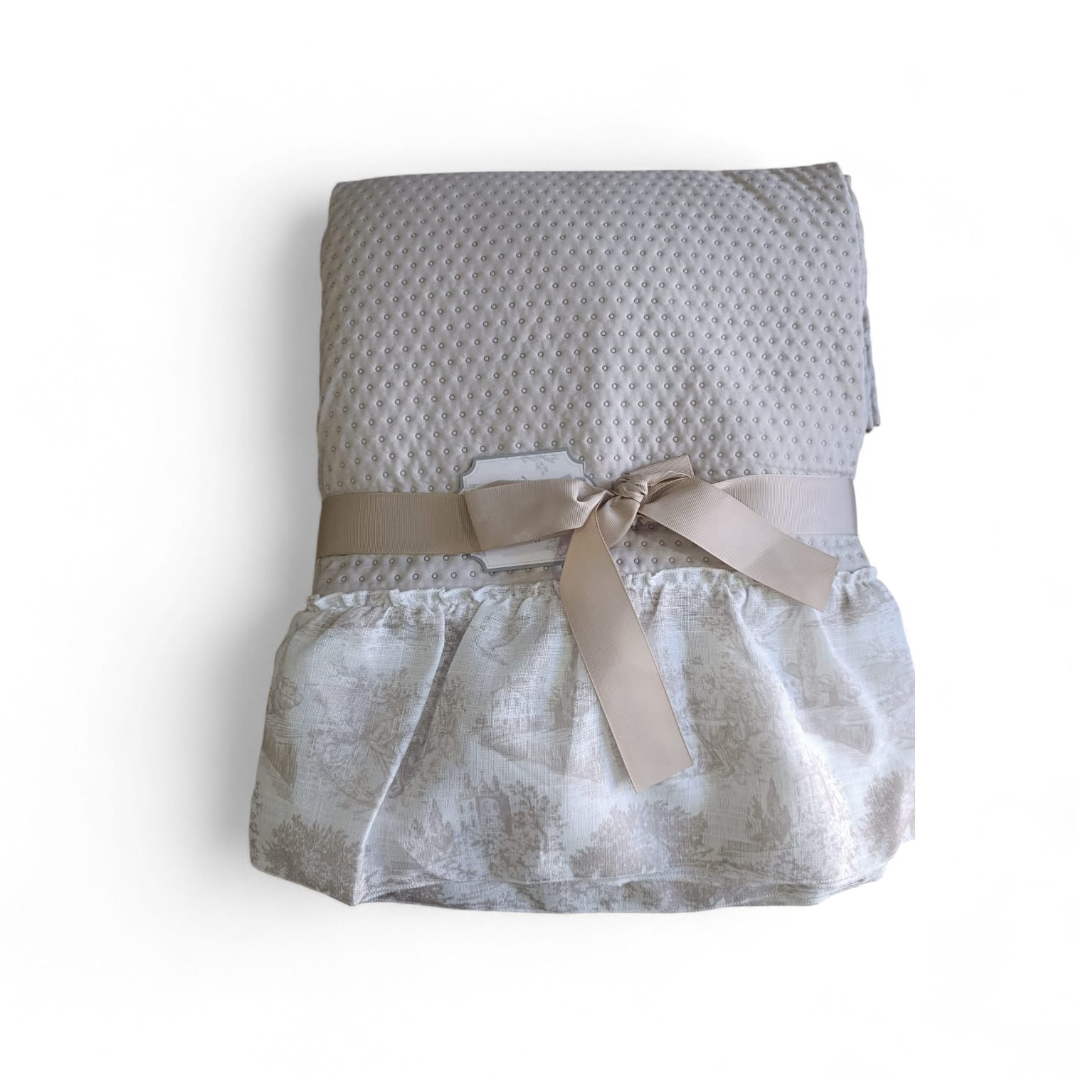 Colcha en tono beige con textura en relieve de pequeños puntos y volante estampado, inspirada en el estilo clásico italiano. Ligera, elegante y perfecta para vestir tu dormitorio con encanto.