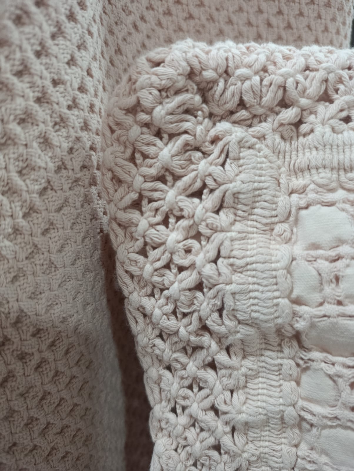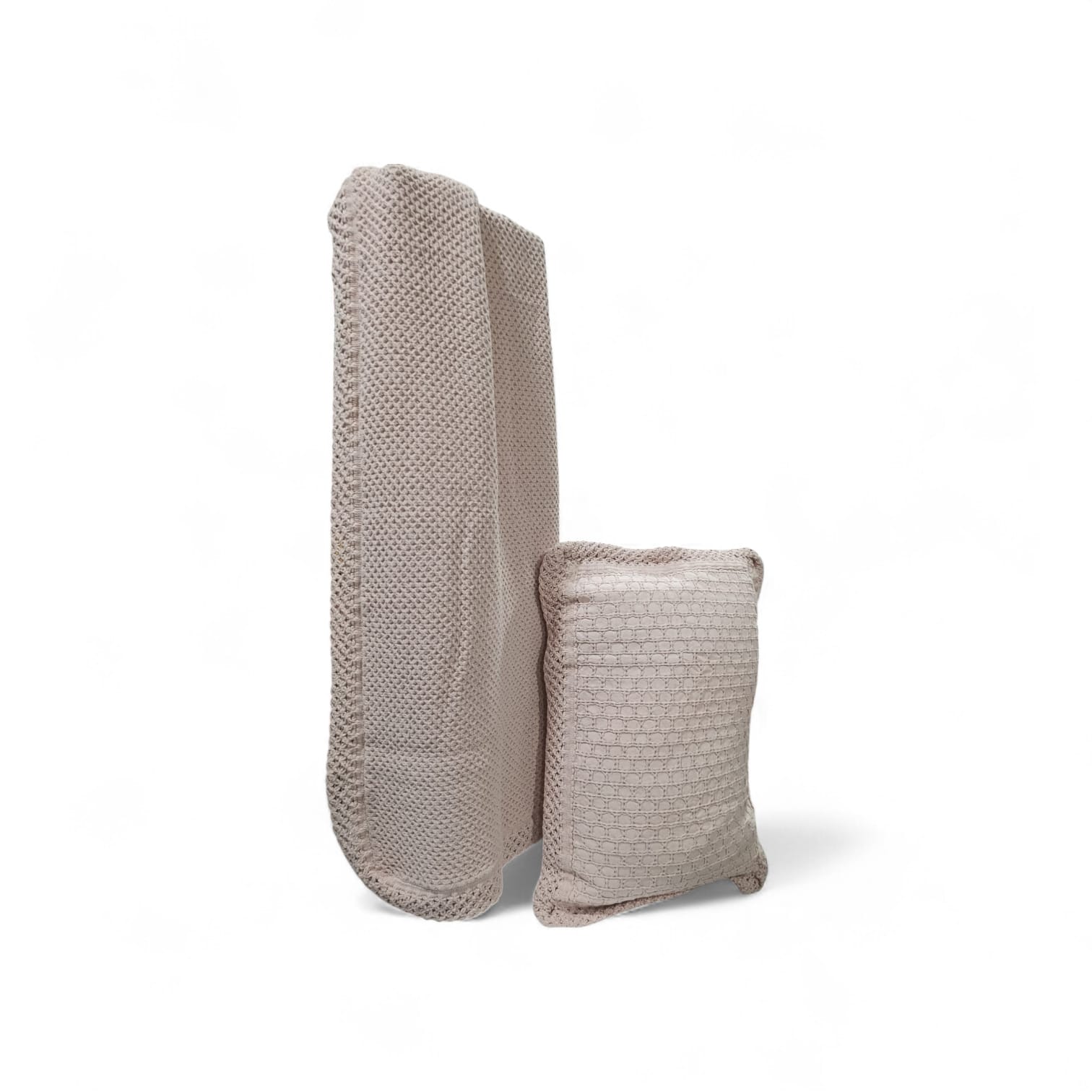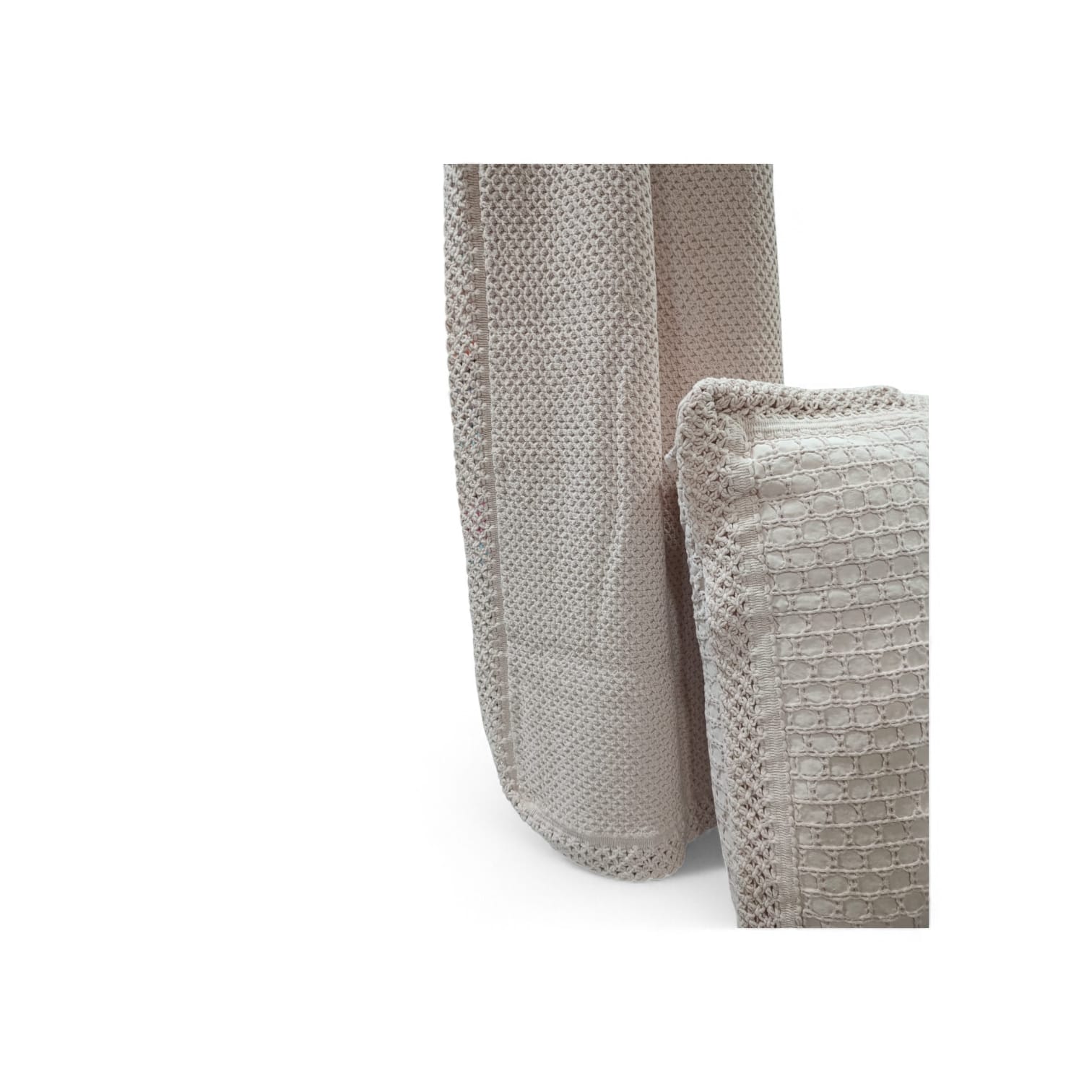 Su tejido estructurado, con relieve suave y detalles cuidadosamente rematados, aporta profundidad visual y una sensación envolvente que transforma cualquier espacio en un refugio de serenidad.